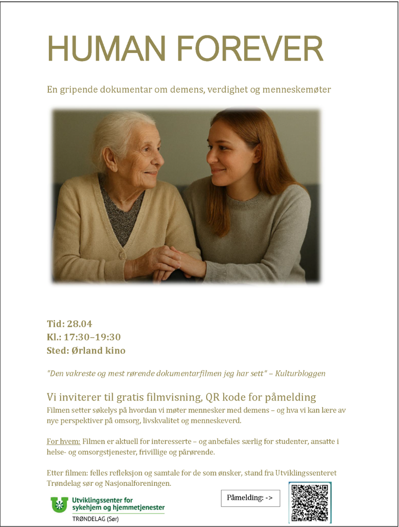 En gripende dokumentar om demens, verdighet og menneskemøterUSHT inviterer til gratis filmvisning. Bruk QR-koden for å melde deg på. Dato: 28.04.Klokka: 17.30-19.30Sted: Ørland Kino